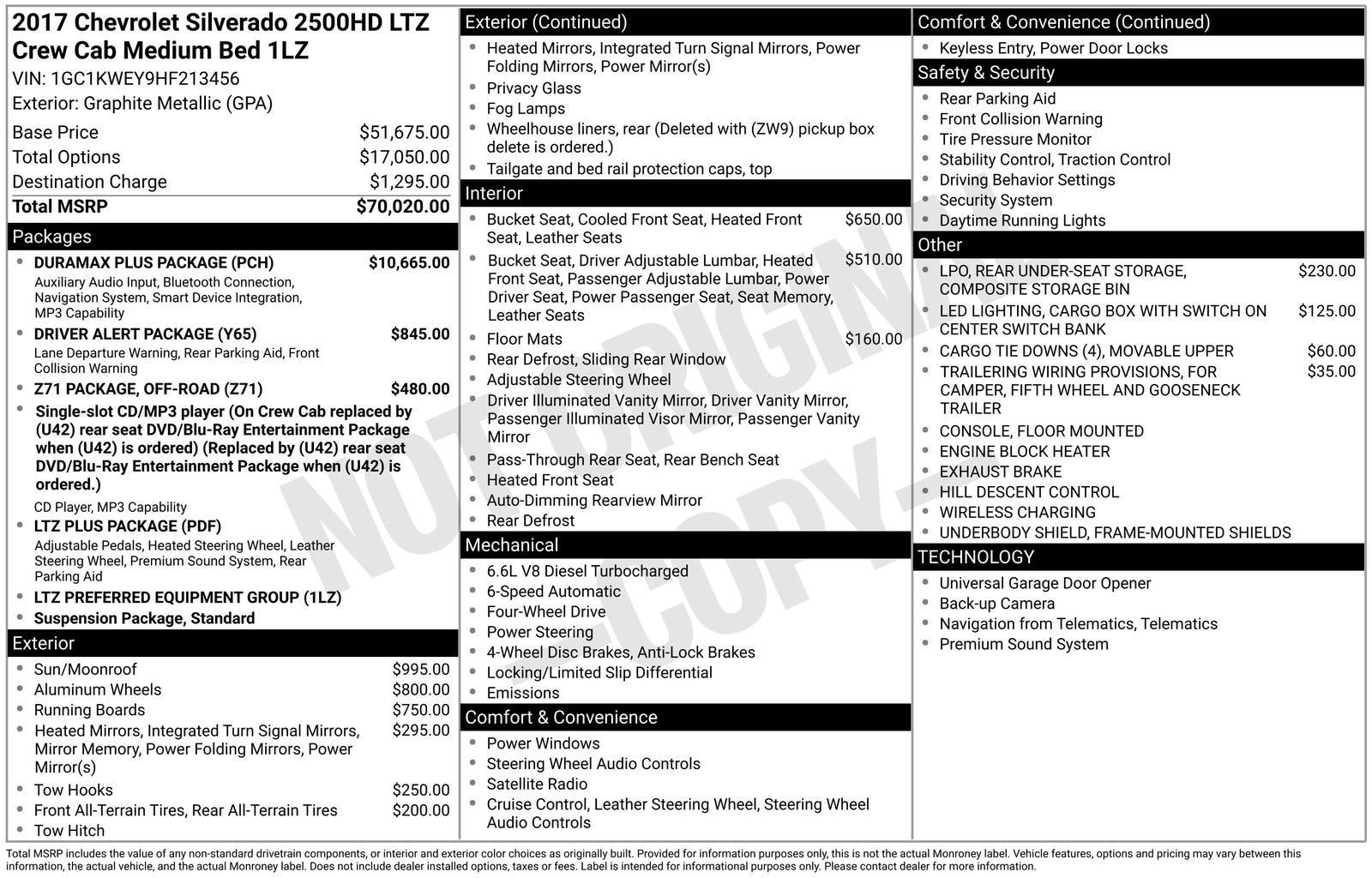 6-Inch Lift Kit 4WD 2500 LTZ Z71 Diesel, Only 26,425 Miles, Fuel Custom Wheels w/ New Tires, Immaculate Condition, New Car Trade-In, One-Owner, Clean Carfax, Non-Smoker. Clean CARFAX. Chrome Trailering Mirrors W/ Power Glass, Power Fold/Man Ext, Heat, Turn Signal, Led Rr Guidance Lamps, Led Amber Lights, And Memory-Equipped Upper Glass, Seats, Front Full Feature Leather Appointed Buckets & Center Console, USB Ports, And Wireless Charging, Audio System, 8 Diagonal Color Touch W/ Navigation & Mylink, Power Adjustable Pedals, Hill Descent Control, Trailer Brake Controller, Engine Block Heater, Cruise Control, Engine Exhaust Brake, High-Capacity Air CleanerK4c - Wireless Charging, Engine Oil Cooling System, Alternator, 150 Amps, HD Aux Trans. Cooling System, Heated & Vented Seats Driver & Front Passenger, Refrigerant Air. Duramax Plus Package; Power Adjustable Pedals, Front and Rear Park Assist, Bose Audio System, Audio System, 8 Diagonal Color Touch W/ Navigation & Mylink Engine Exhaust Brake. LTZ Plus Package: Power Adjustable Pedals Bose Audio System Front and Rear Park Assist Heated Steering Wheel, LTZ Plus Package EZ Lift and Lower Tailgate. Z71 Off-Road Package: Twin Tube Rancho Shocks, Underbody Shields, Hill Descent Control, Door Sill Plates, Unique Z71 Grille Z71 Emblems. Graphite Metallic 2017 Chevrolet Silverado 2500HD LTZ 4WD Allison 1000 6-Speed Automatic Duramax 6.6L V8 Turbodiesel. Jet Black Leather.