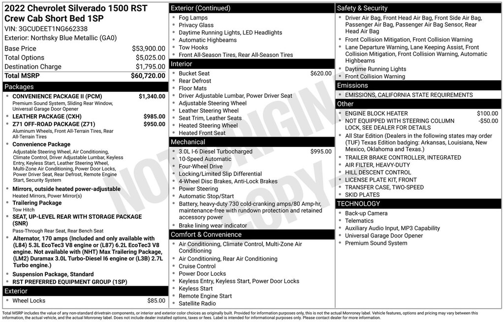 CARFAX One-Owner. 4WD Diesel RST. Clean CARFAX. Certified. Northsky Blue Metallic 2022 Chevrolet Silverado 1500 RST 4WD 10-Speed Automatic 3.0L I6 10-Speed Automatic, 4WD, Black Leather.Recent Arrival! 22/26 City/Highway MPGChevrolet Certified Pre-Owned Details:* 24 months/24,000 miles (whichever comes first) Certified Pre-Owned Scheduled Maintenance Plan and 3 days/150 miles (whichever comes first) Vehicle Exchange Program. SiriusXM 3-month trial subscription.* 172 Point Inspection* Transferable Warranty* Vehicle History* Limited Warranty: 12 Month/12,000 Mile (whichever comes first) from certified purchase date* Powertrain Limited Warranty: 72 Month/100,000 Mile (whichever comes first) from original in-service date* Warranty Deductible: $0* Roadside AssistanceSee all our inventory at WWW.TRACYCHEVROLET.COM.